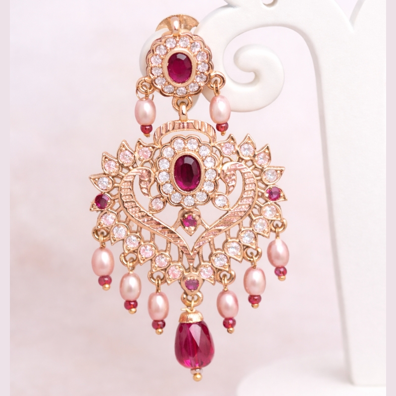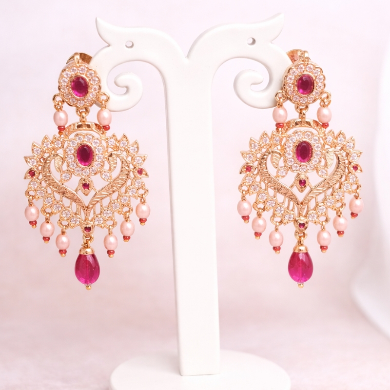 A stunning pair of handcrafted ruby-toned drop earrings designed to capture timeless romance and regal elegance. Featuring intricate gold-finish filigree work adorned with shimmering crystal accents, deep ruby stones, and delicate pearl drops, these earrings exude vintage charm with a modern festive appeal.