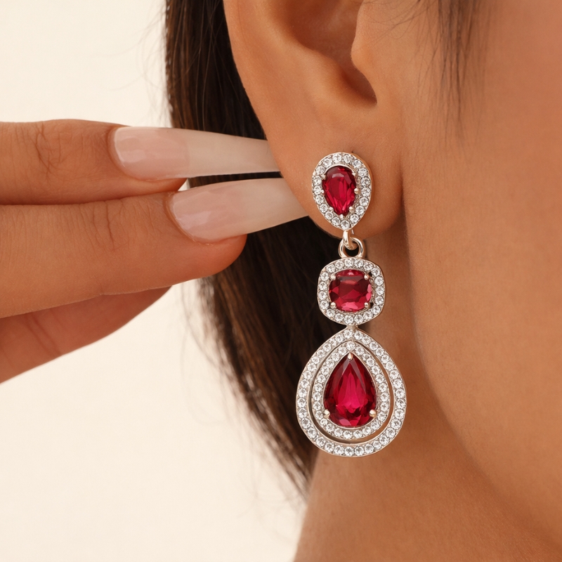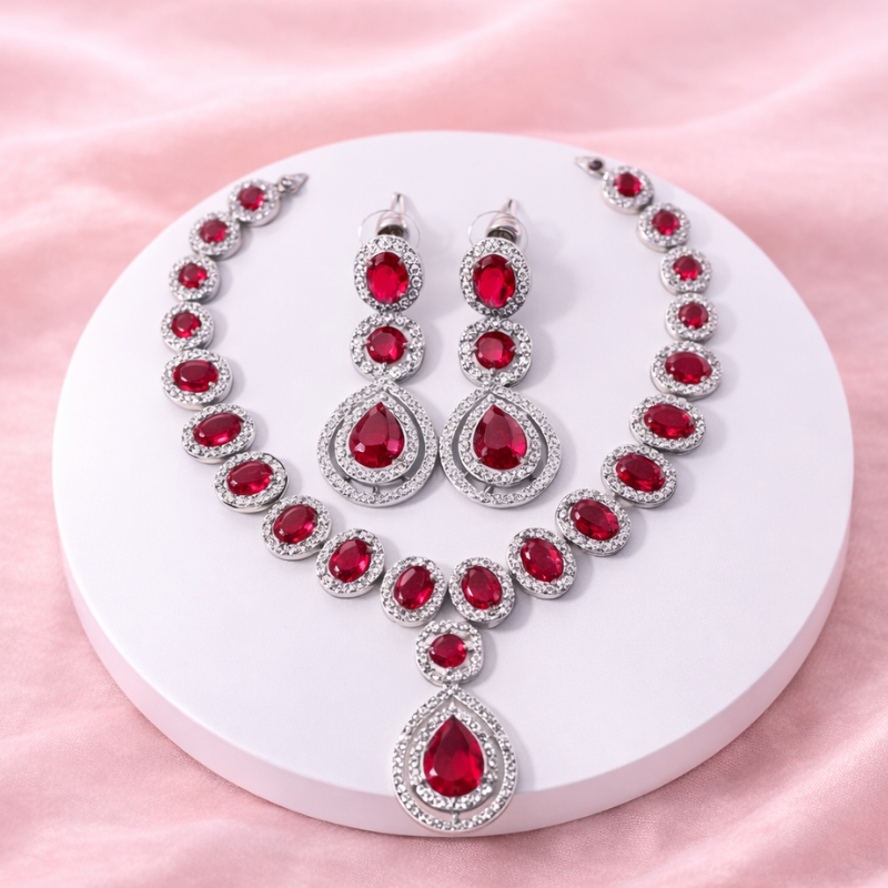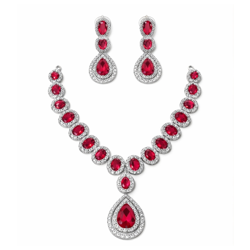 An elegant crimson stone necklace set with matching earrings, thoughtfully designed to create a striking statement. Accented with shimmering detailing and a graceful drop silhouette, this handcrafted set adds timeless charm to every special occasion.