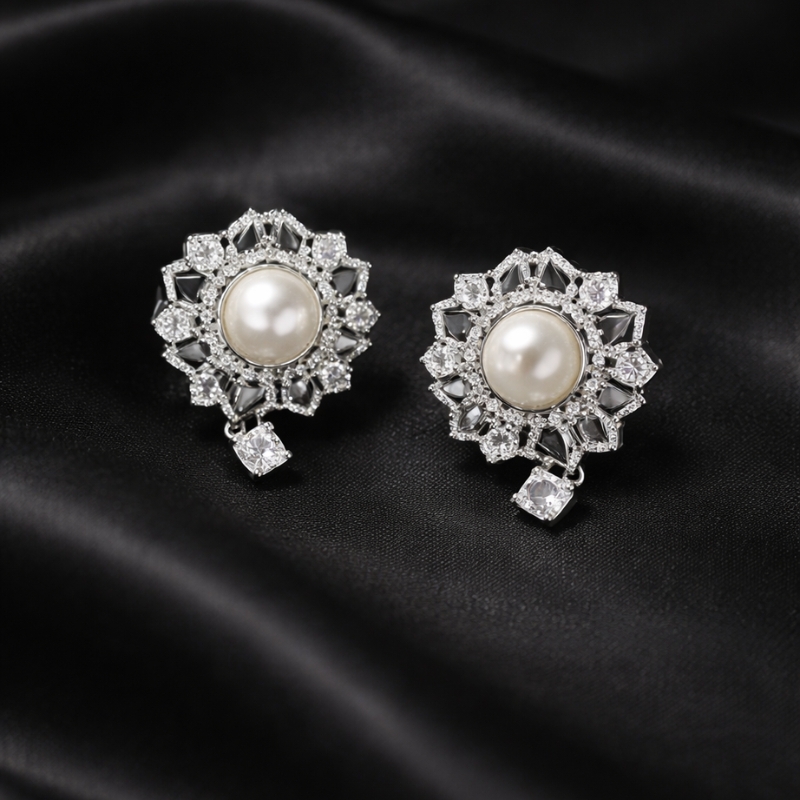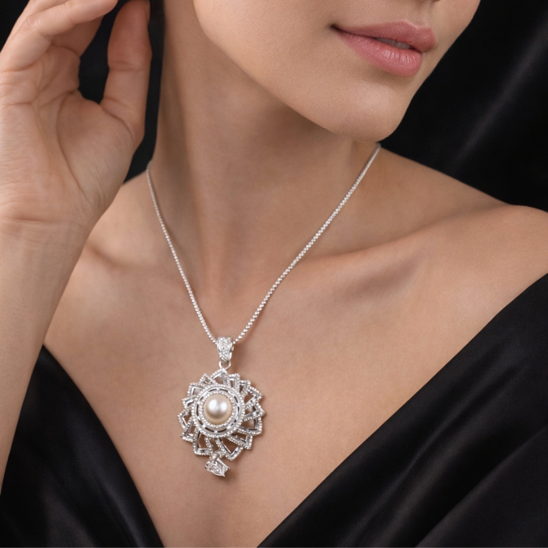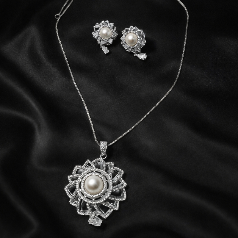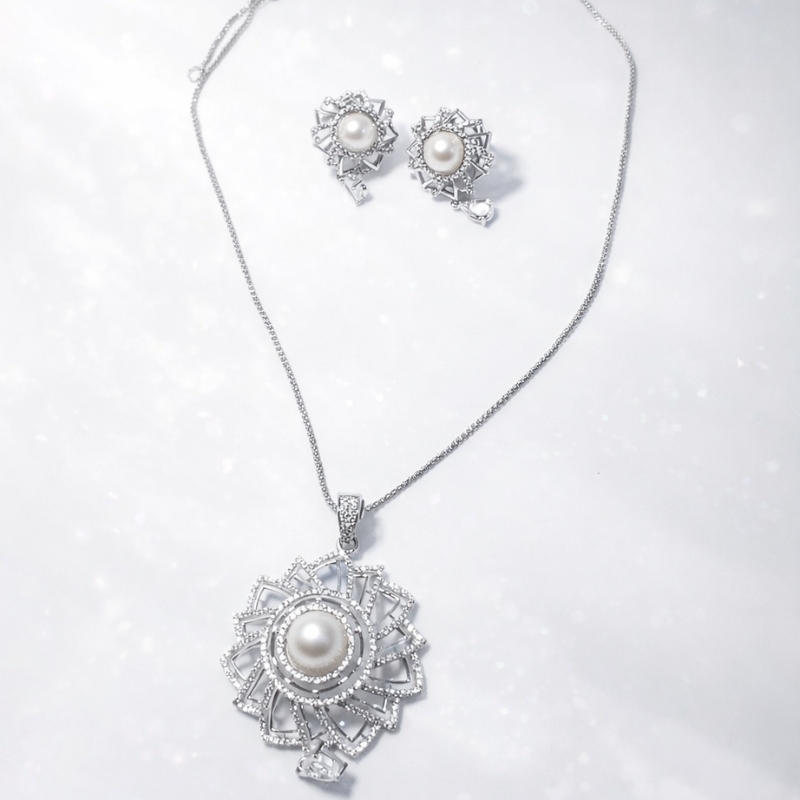 A beautifully handcrafted pendant and earring set designed with intricate geometric layers and a luminous pearl centerpiece. Accented with delicate crystal detailing and finished in a sleek silver-tone setting, this set radiates sophistication with a soft, graceful sparkle. Its floral-inspired structure blends modern design with timeless elegance, making it a standout piece for refined occasions.