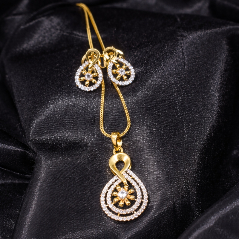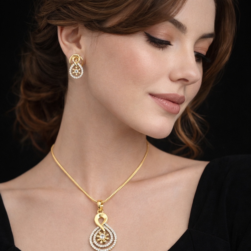 A beautifully handcrafted pendant and earring set designed with graceful layered crystal detailing and a delicate central floral motif, finished in a rich gold-tone setting for a warm and sophisticated glow. The flowing teardrop silhouette adds a soft elegance, making this set perfect for refined everyday wear and special occasions alike.