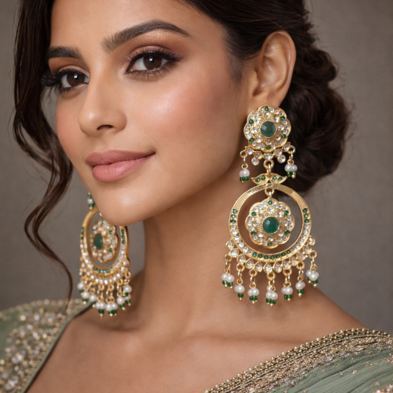 These statement chandbali earrings are perfect for weddings, festive occasions, and special celebrations. They pair effortlessly with sarees, lehengas, and ethnic wear while also elevating fusion outfits. The emerald tones and pearl detailing add depth, sparkle, and a refined luxurious finish to your look.
