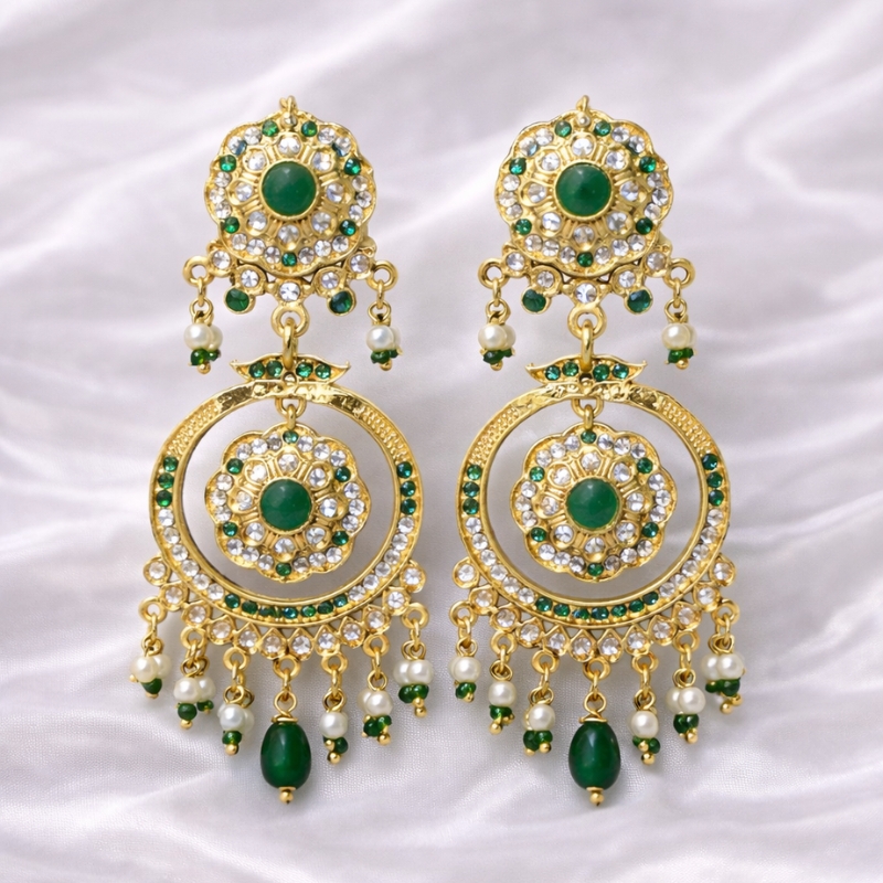 A beautifully handcrafted pair of circular chandbali earrings featuring intricate gold-toned rings adorned with shimmering stones and rich emerald green accents. Finished with delicate pearl drops and a graceful green stone centre, these earrings blend traditional charm with modern elegance.