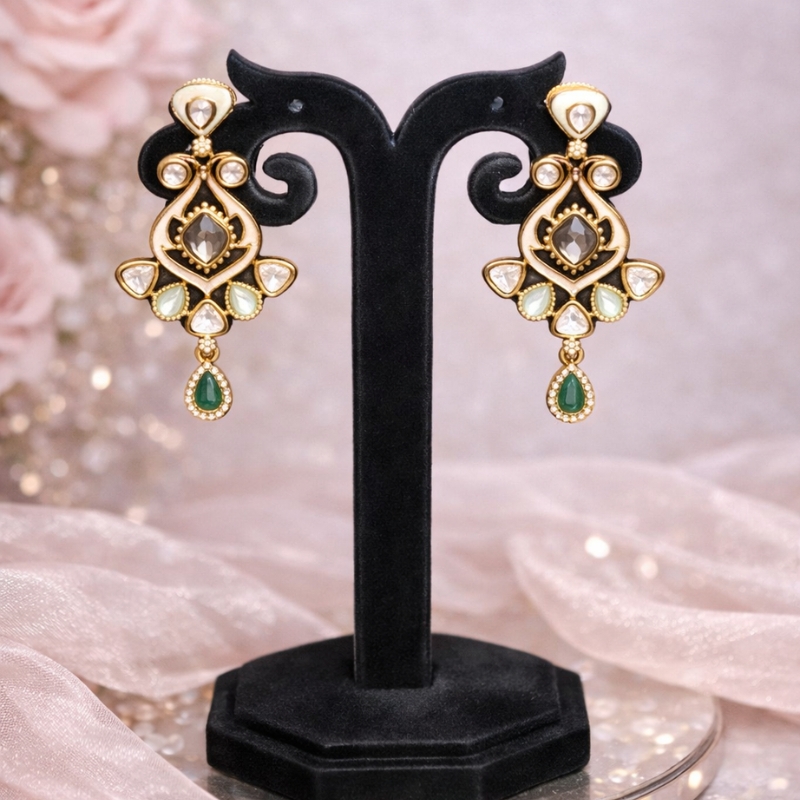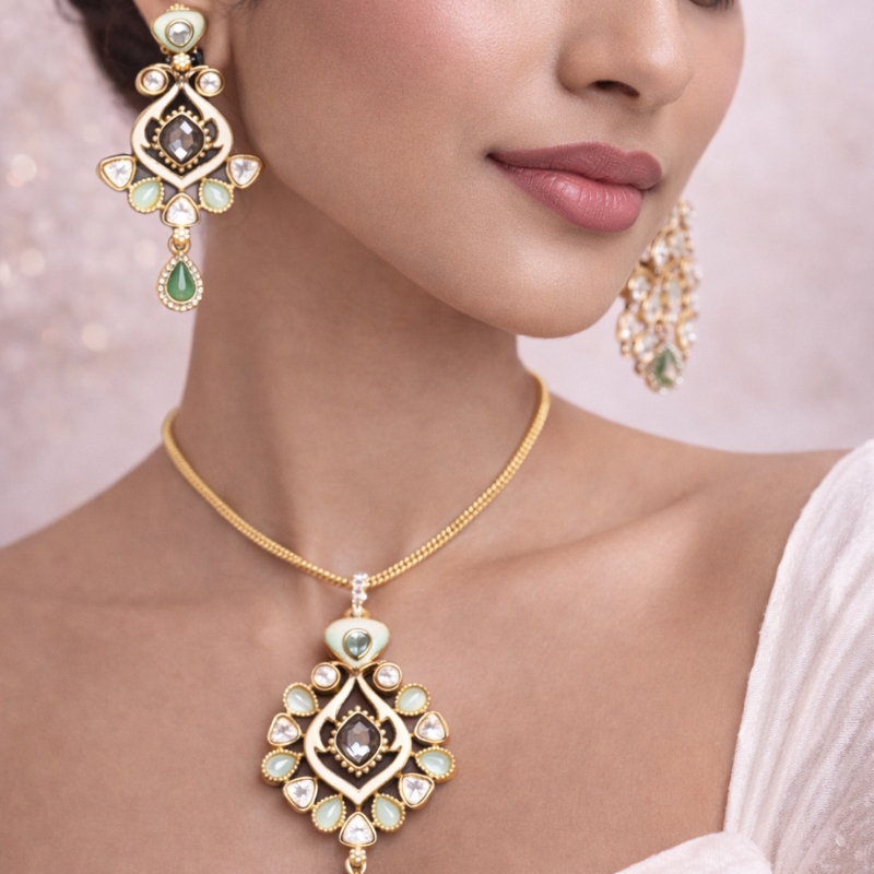 An opulent handcrafted necklace and earring set inspired by royal heritage and timeless artistry. Designed with intricate gold-finish detailing, this statement set features a striking arrangement of emerald-green accents, luminous enamel work, and shimmering crystal stones centered around a bold faceted centerpiece.