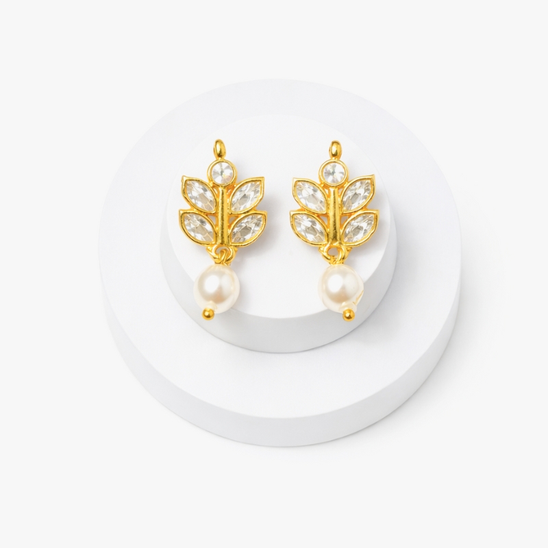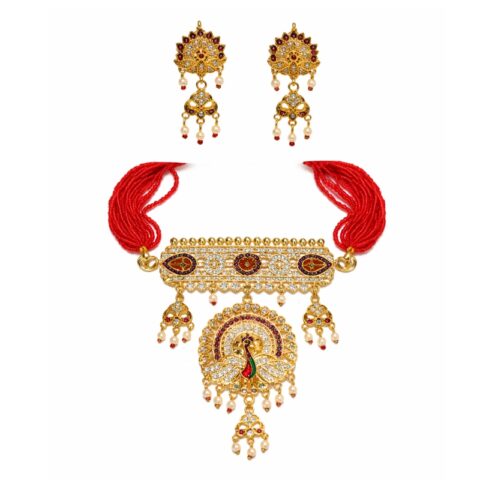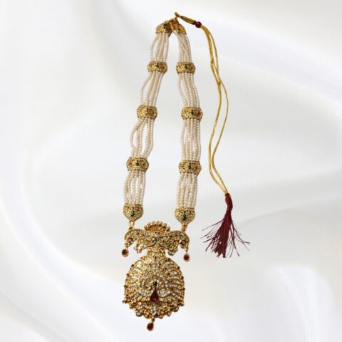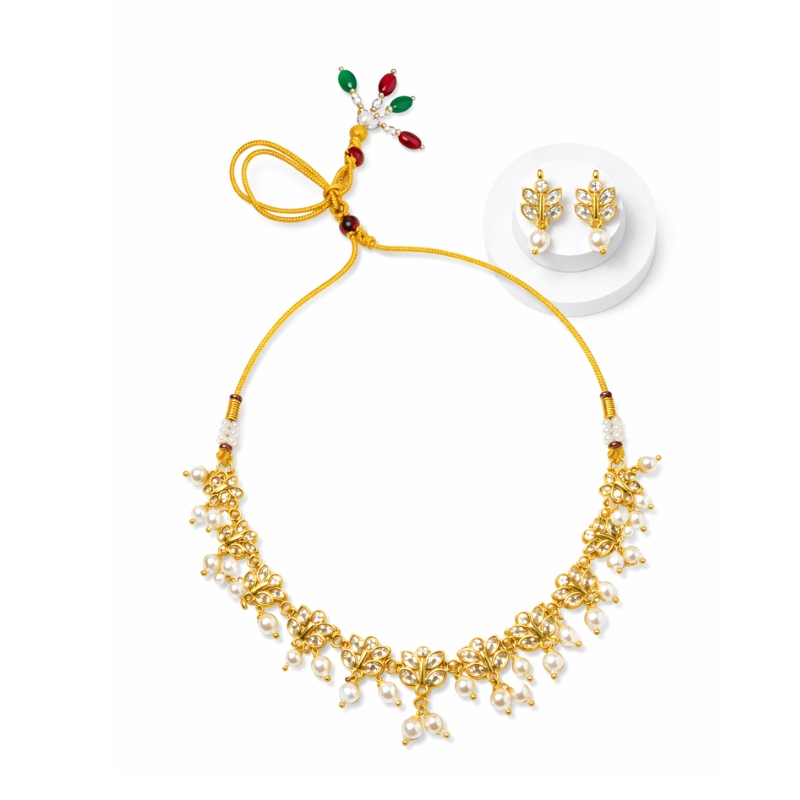 A beautifully handcrafted necklace and earring set designed with intricate gold-toned detailing and delicate pearl drops that create a soft, graceful shimmer. Featuring leaf-inspired motifs accented with fine stones, this elegant set offers a perfect balance of tradition and contemporary charm for refined occasions.