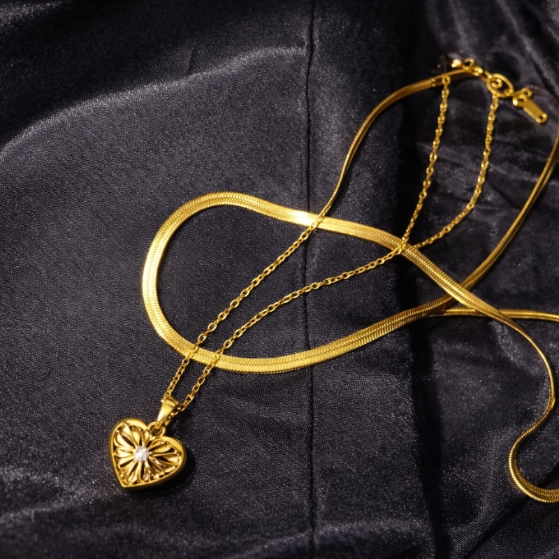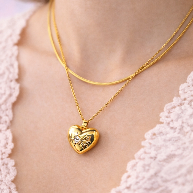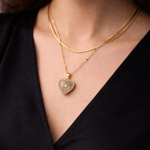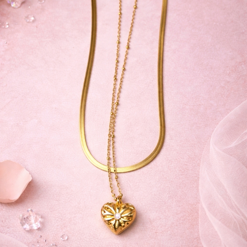 A beautifully handcrafted layered necklace designed with smooth gold-tone chains and a delicately detailed heart-shaped pendant accented with a subtle crystal sparkle at the center. The dual-chain design adds graceful depth and modern elegance, making this piece perfect for everyday wear as well as special occasions.