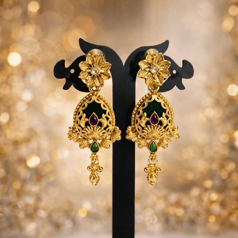 A beautifully detailed piece, the Lotus Charm Necklace features intricate circular motifs connected with delicate craftsmanship and colourful stone accents. The centerpiece showcases a graceful lotus-inspired design, complemented by small dangling charms that add subtle movement and sparkle. Finished with an adjustable thread closure, this necklace offers both comfort and elegance, making it a perfect blend of traditional artistry and everyday versatility.