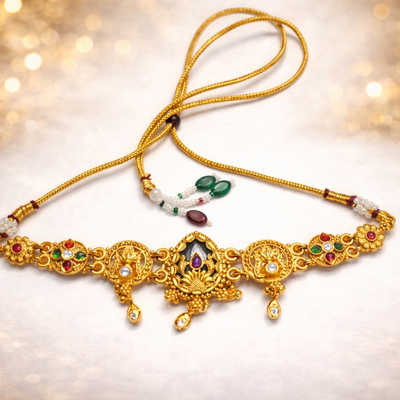 Perfect for festive occasions, cultural celebrations, and traditional events, this necklace pairs beautifully with silk sarees, ethnic kurtas, lehengas, and festive outfits. The adjustable design also makes it ideal for layering with other jewellery pieces.