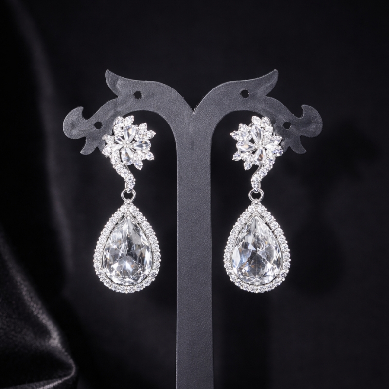 A beautifully handcrafted pair of statement earrings designed with delicate crystal floral studs leading into radiant teardrop-shaped drops framed by shimmering halo accents. Finished in a sleek silver-tone setting, these earrings capture light with breathtaking brilliance, offering a perfect balance of graceful movement and timeless elegance.