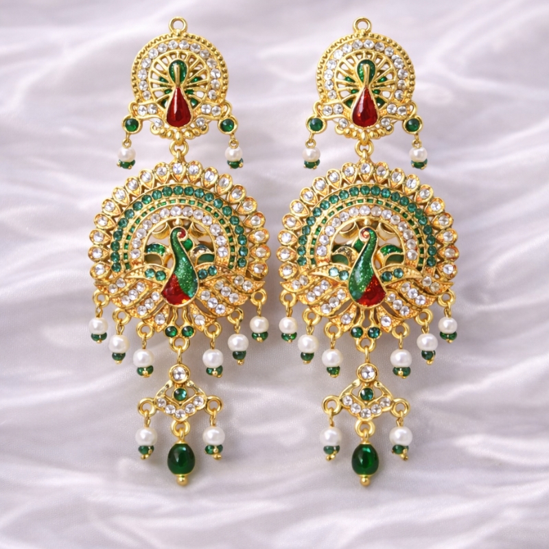 Inspired by the grace of the peacock, these handcrafted heritage drop earrings feature intricate gold detailing, emerald green accents, and a striking ruby-toned centerpiece. Finished with delicate pearl drops and shimmering stones, this statement design brings royal elegance and festive charm to every look. Each element is carefully crafted to create a bold yet graceful silhouette that stands out beautifully.