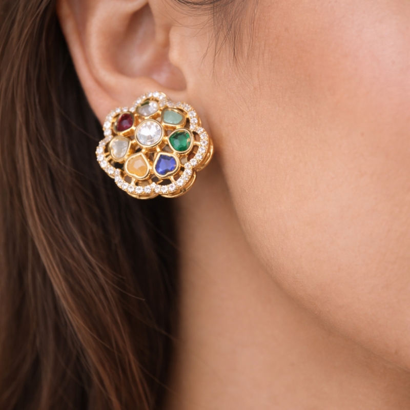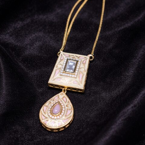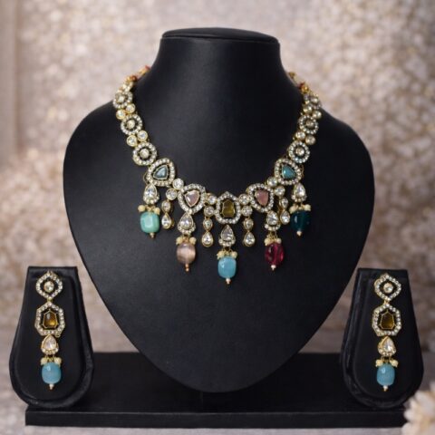 A vibrant and elegant design, the Navrang Mangalsutra Pendant Set features a beautifully crafted floral pendant adorned with multicolour stones and delicate crystal accents. The intricate arrangement of colourful stones creates a radiant centerpiece, while the sleek chain adds a modern touch to the traditional design. Paired with matching earrings, this set offers a graceful blend of tradition and contemporary style, making it perfect for special occasions and festive celebrations.