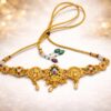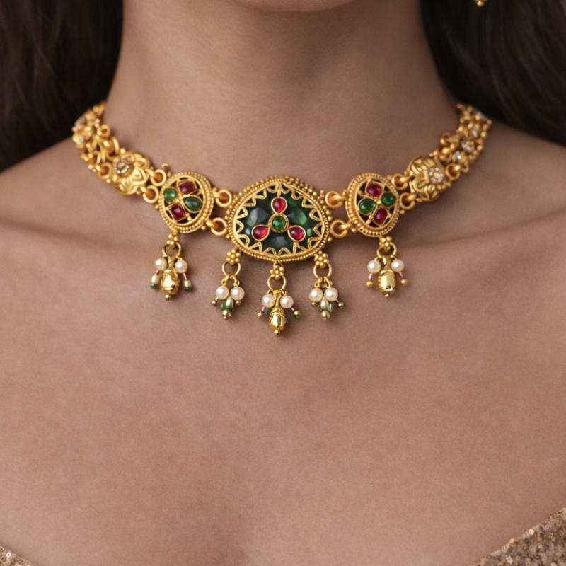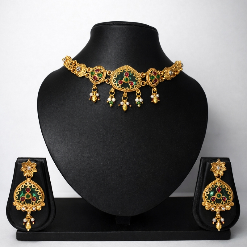 A delicate and elegant design, the Petal Charm Necklace Set features beautifully crafted motifs with rich green accents and subtle red highlights set in a gold-toned frame. The centerpiece is adorned with tiny hanging charms and pearl drops that add graceful movement and sparkle. Paired with matching earrings, this set blends intricate detailing with a refined silhouette, making it a perfect addition to festive and occasion wear.