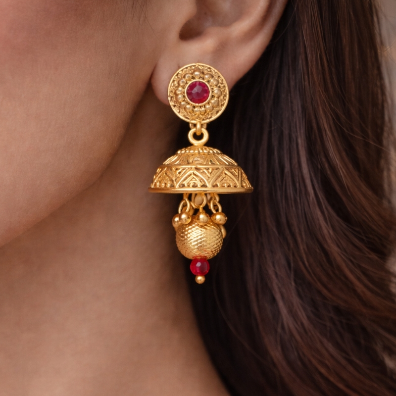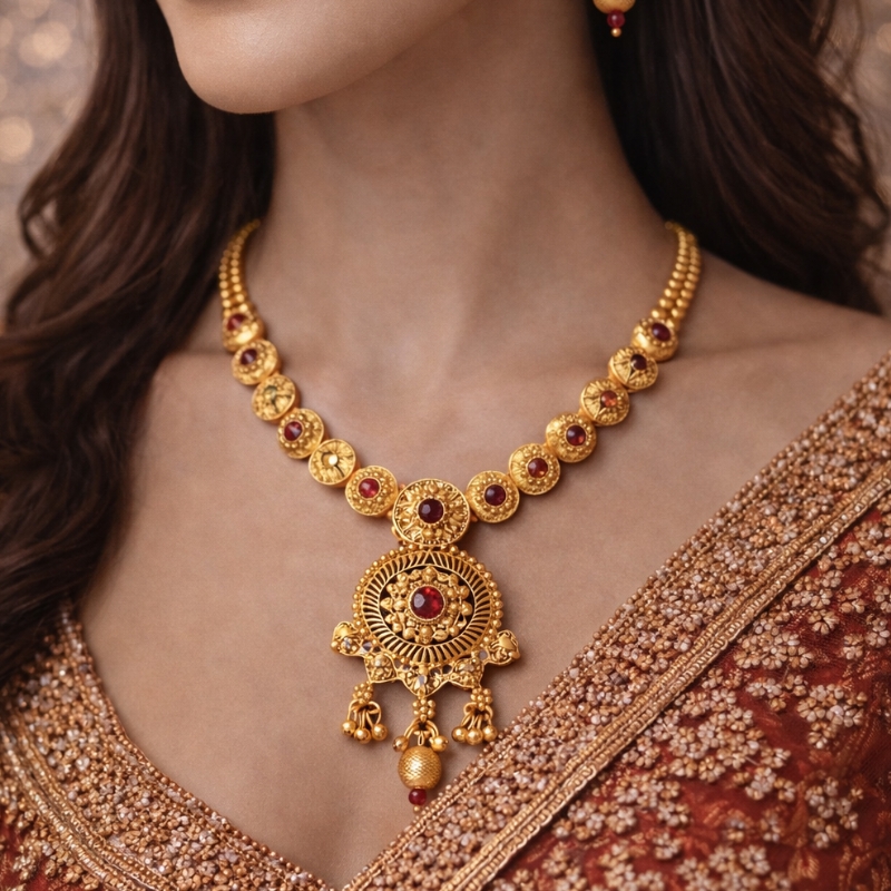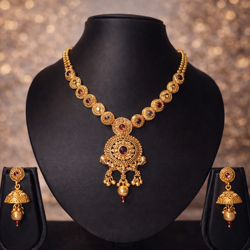 The Raya Regal Coin Necklace Set is a striking blend of traditional artistry and refined modern elegance. Featuring a series of intricately crafted coin-inspired motifs leading to a bold circular pendant, this necklace is adorned with rich ruby-toned stone accents and detailed antique gold-finish craftsmanship. The ornate central pendant with delicate dangling elements adds graceful movement, while the matching jhumka-style earrings complete the ensemble with timeless charm.