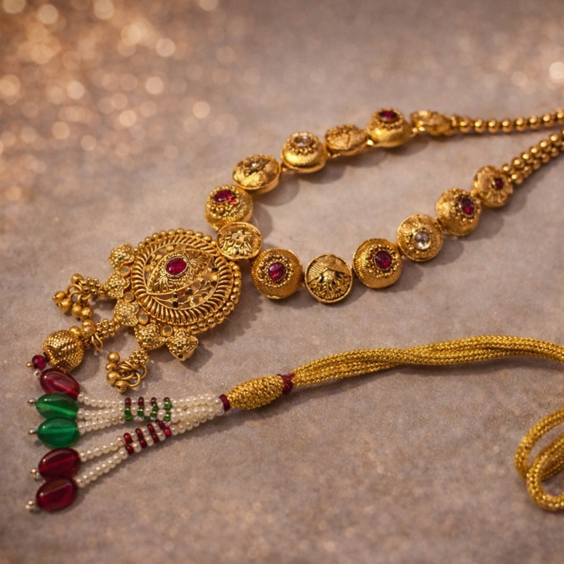 Ideal for weddings, festive celebrations, and cultural gatherings, this necklace set pairs beautifully with silk sarees, Banarasi drapes, and traditional lehengas. It also complements handloom fabrics and classic ethnic outfits for a regal, well-balanced look.