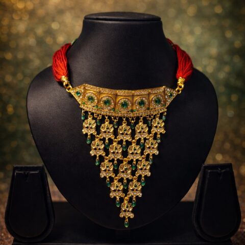 A striking blend of intricate craftsmanship and bold design, this gold-toned necklace set features finely detailed motifs highlighted with rich ruby-red and emerald-green stones. The structured pendant and delicate bead accents create a refined statement while maintaining a graceful traditional charm. Paired with matching earrings, this set adds depth, elegance, and character to any festive or occasion-ready look.