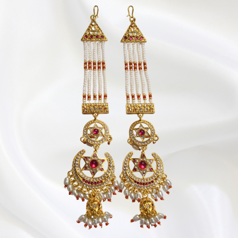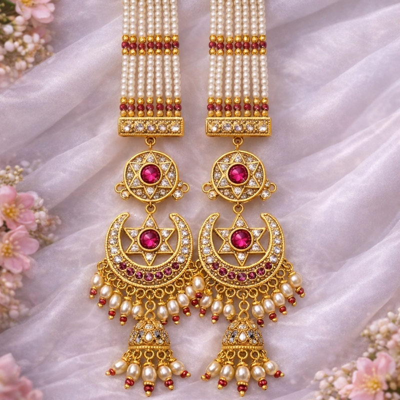 A stunning handcrafted pair of long drop earrings featuring cascading pearl strands connected to intricately designed crescent motifs adorned with shimmering stones and ruby-toned accents. Finished with delicate pearl tassels, these earrings blend regal tradition with graceful movement for a truly striking look.