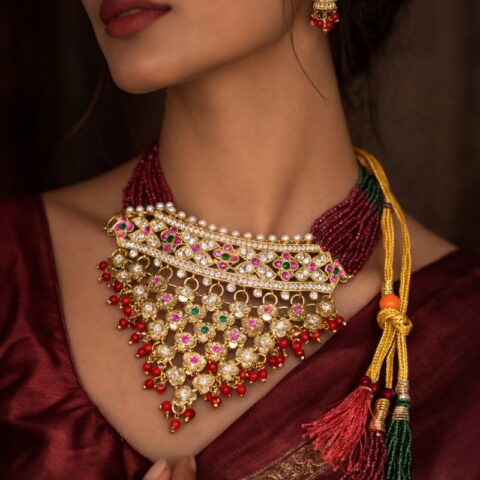 Ideal for weddings, festive celebrations, and evening events, this necklace set pairs effortlessly with silk sarees, embroidered lehengas, and rich ethnic ensembles. It also complements fusion outfits for a polished, standout appearance.