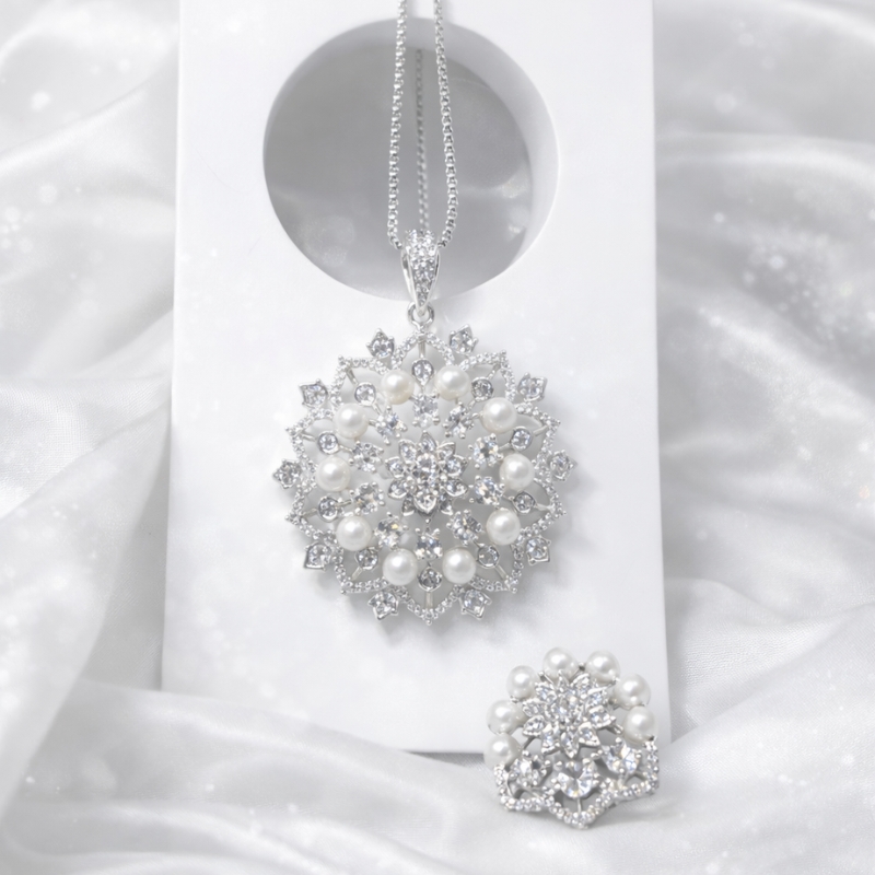 A beautifully handcrafted pendant and earring set designed with layered crystal accents and luminous pearl detailing arranged in a graceful floral-inspired pattern. The radiant centerpiece sparkles with delicate brilliance, while the surrounding pearl halo adds a soft, luxurious charm. Finished in a sleek silver-tone setting, this set offers a perfect blend of timeless elegance and modern sophistication.