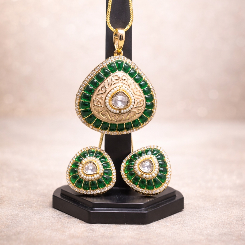 This pendant set is available in three stunning colour variations – Green, Ruby, and Blush Pink, allowing you to choose the shade that best complements your style and outfit.