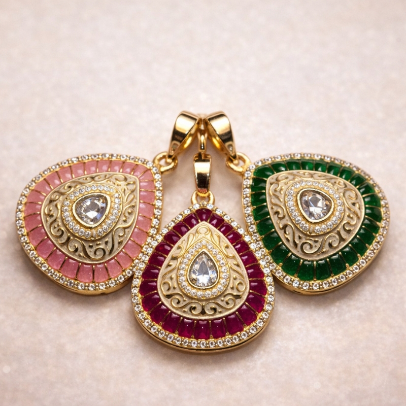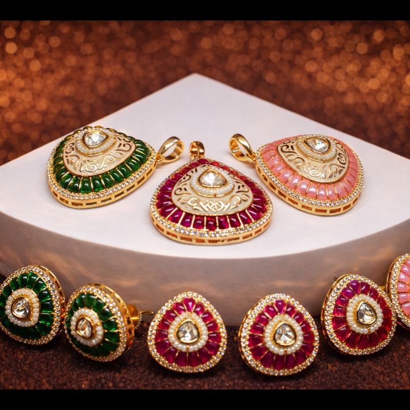Perfect for festive gatherings, weddings, and special occasions, this pendant set pairs beautifully with sarees, lehengas, anarkalis, and elegant ethnic wear. The green variation complements traditional outfits, while the ruby and pink options pair beautifully with contemporary and pastel ensembles.