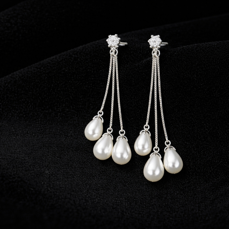 A beautifully handcrafted pair of long drop earrings designed with delicate silver-tone chains finished with graceful teardrop pearl accents. The subtle crystal-studded top adds a soft sparkle, while the flowing chain design creates elegant movement with every step. Lightweight yet striking, these earrings offer timeless sophistication for both everyday wear and special occasions.